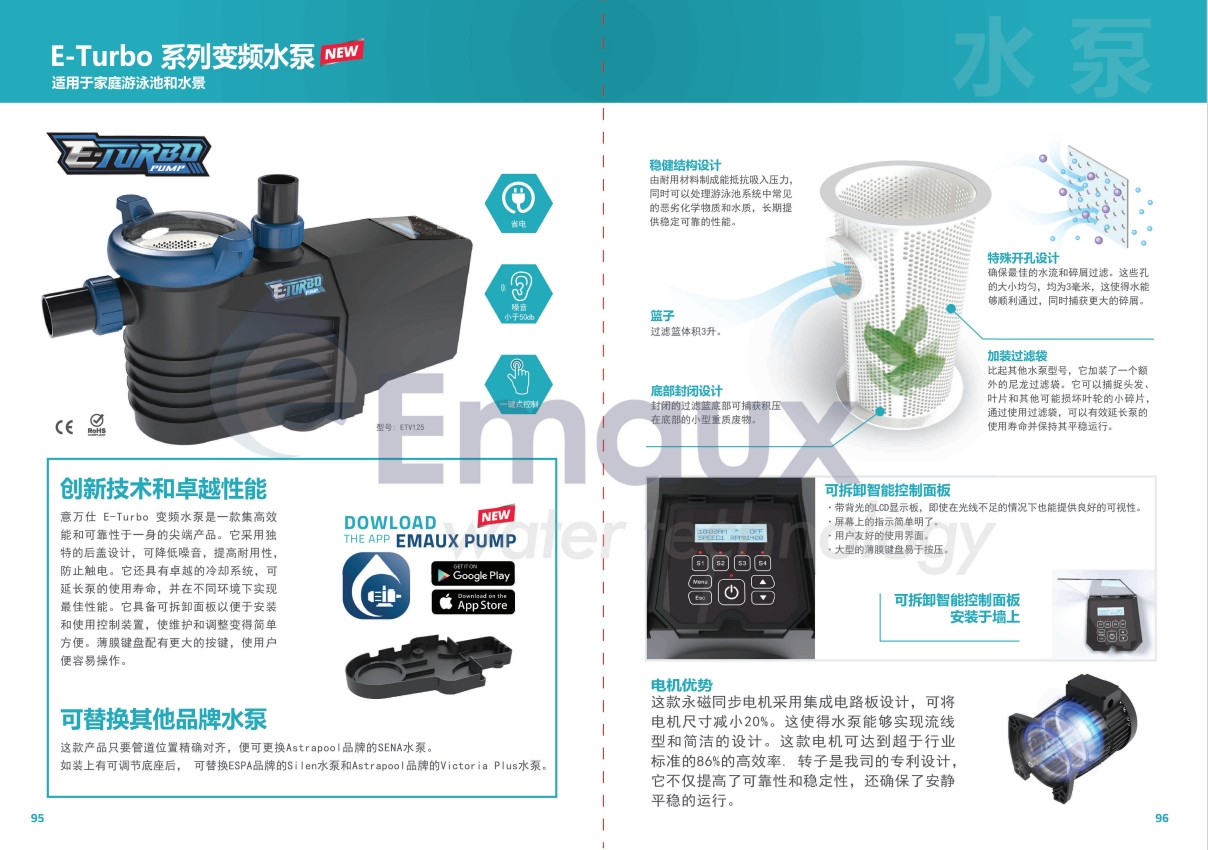 競技池意萬仕 E-Turbo 變頻水泵是一款集高效能和可靠性于一身的尖端產(chǎn)品。它采用獨特的后蓋設(shè)計,可降低噪音,提高耐用性,防止觸電。它還具有卓越的冷卻系統(tǒng),可延長泵的使用壽命,并在不同環(huán)境下實現(xiàn)最佳性能。它具備可拆卸面板以便于安裝和使用控制裝置,使維護(hù)和調(diào)整變得簡單方便。薄膜鍵盤配有更大的按鍵,使用戶便容易操作。