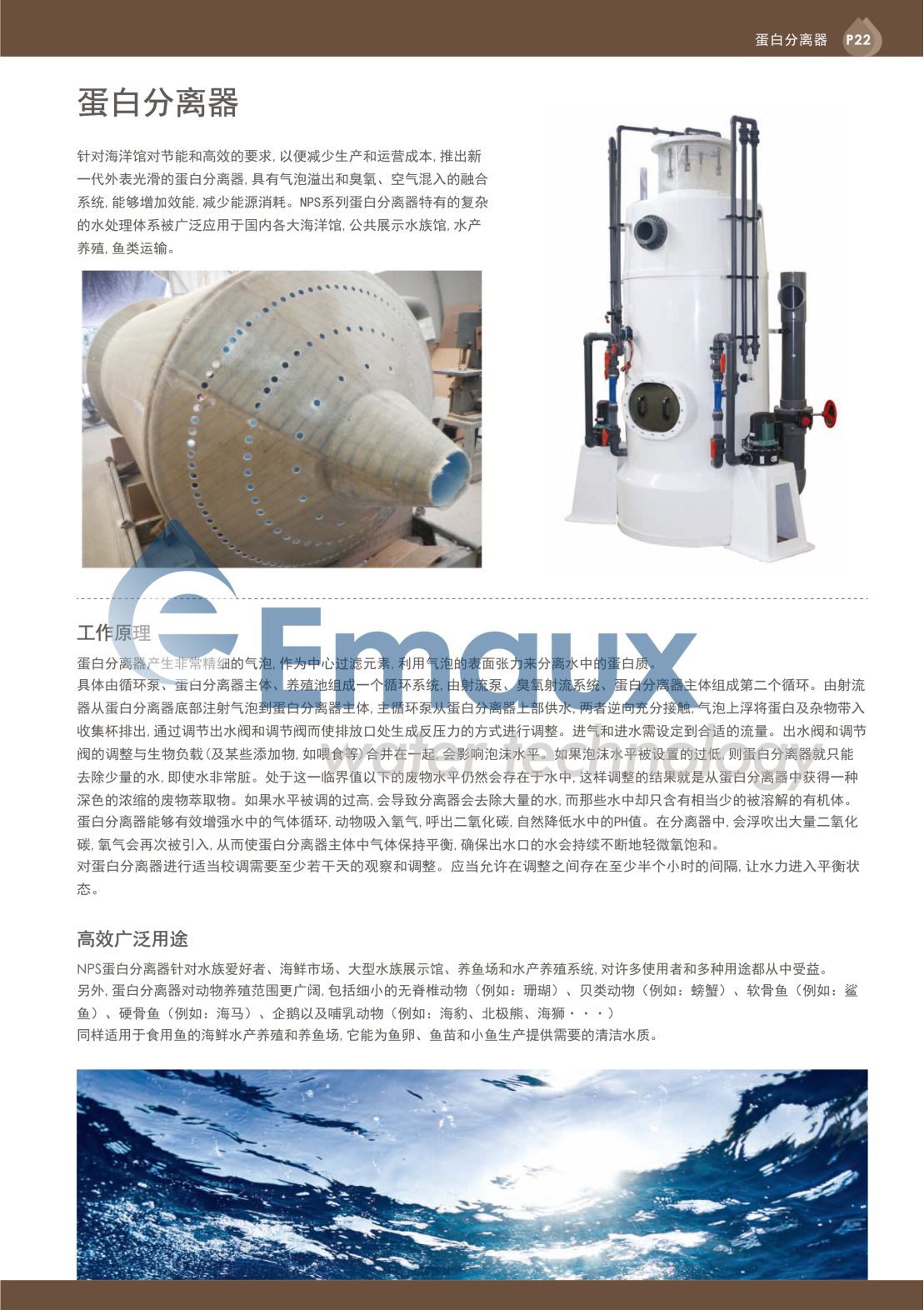 針對海洋館對節能和高效的要求, 以便減少生產和運營成本, 推出新一代外表光滑的蛋白分離器, 具有氣泡溢出和臭氧、空氣混入的融合系統能夠增加效能減少能源消耗。 NPS系列蛋白分離器特有的復雜的水處理體系被廣泛應用千國內各大海洋館, 公共展示水族館, 水產養殖魚類運輸。