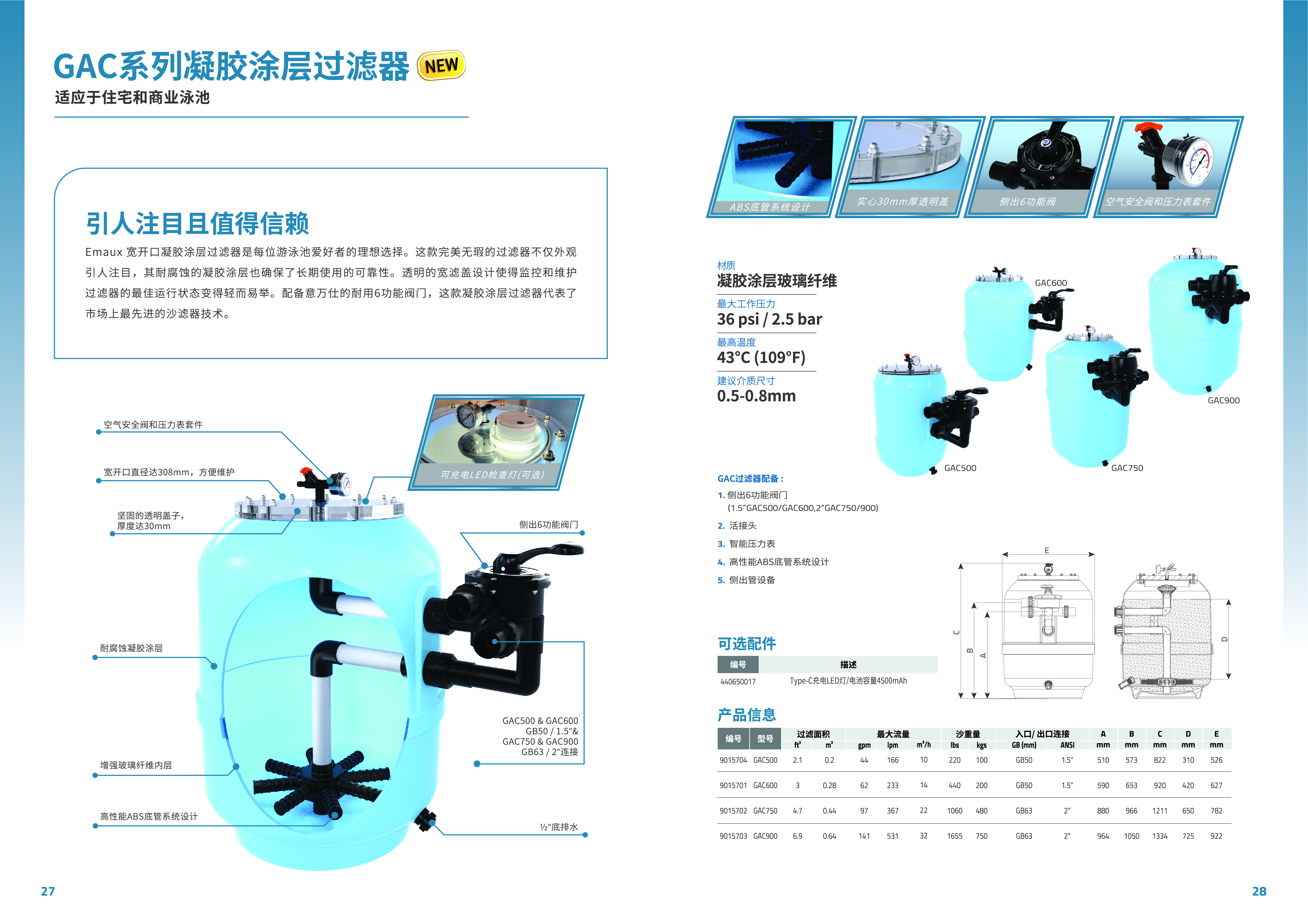 Emaux 寬開口凝膠涂層過濾器是每位游泳池愛好者的理想選擇。這款完美無瑕的過濾器不僅外觀 引人注目,其耐腐蝕的凝膠涂層也確保了長期使用的可靠性。透明的寬濾蓋設計使得監控和維護 過濾器的最佳運行狀態變得輕而易舉。配備意萬仕的耐用6功能閥門,這款凝膠涂層過濾器代表了 市場上最先進的沙濾器技術。