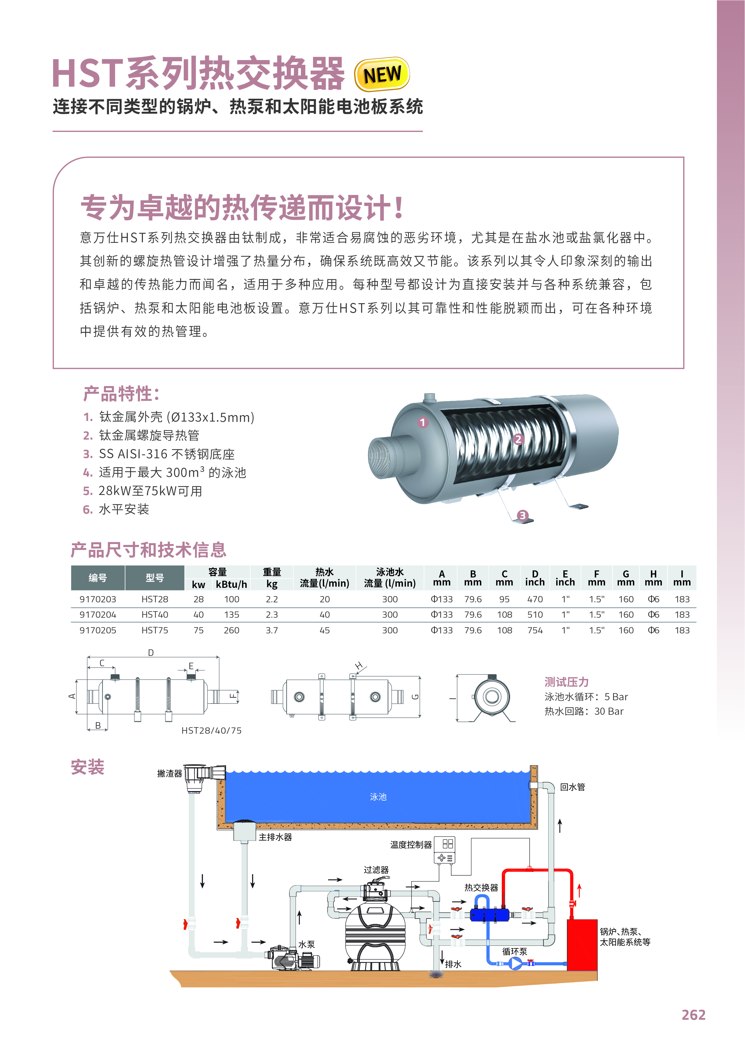 意萬仕HST系列熱交換器由鈦制成,?常適合易腐蝕的惡劣環境,尤其是在鹽水池或鹽氯化器中。 其創新的螺旋熱管設計增強了熱量分布,確保系統既?效?節能。該系列以其令?印象深刻的輸出 和卓越的傳熱能力而聞名,適用于多種應用。每種型號都設計為直接安裝并與各種系統兼容,包 括鍋爐、熱泵和太陽能電池板設置。意萬仕HST系列以其可靠性和性能脫穎而出,可在各種環境 中提供有效的熱管理。