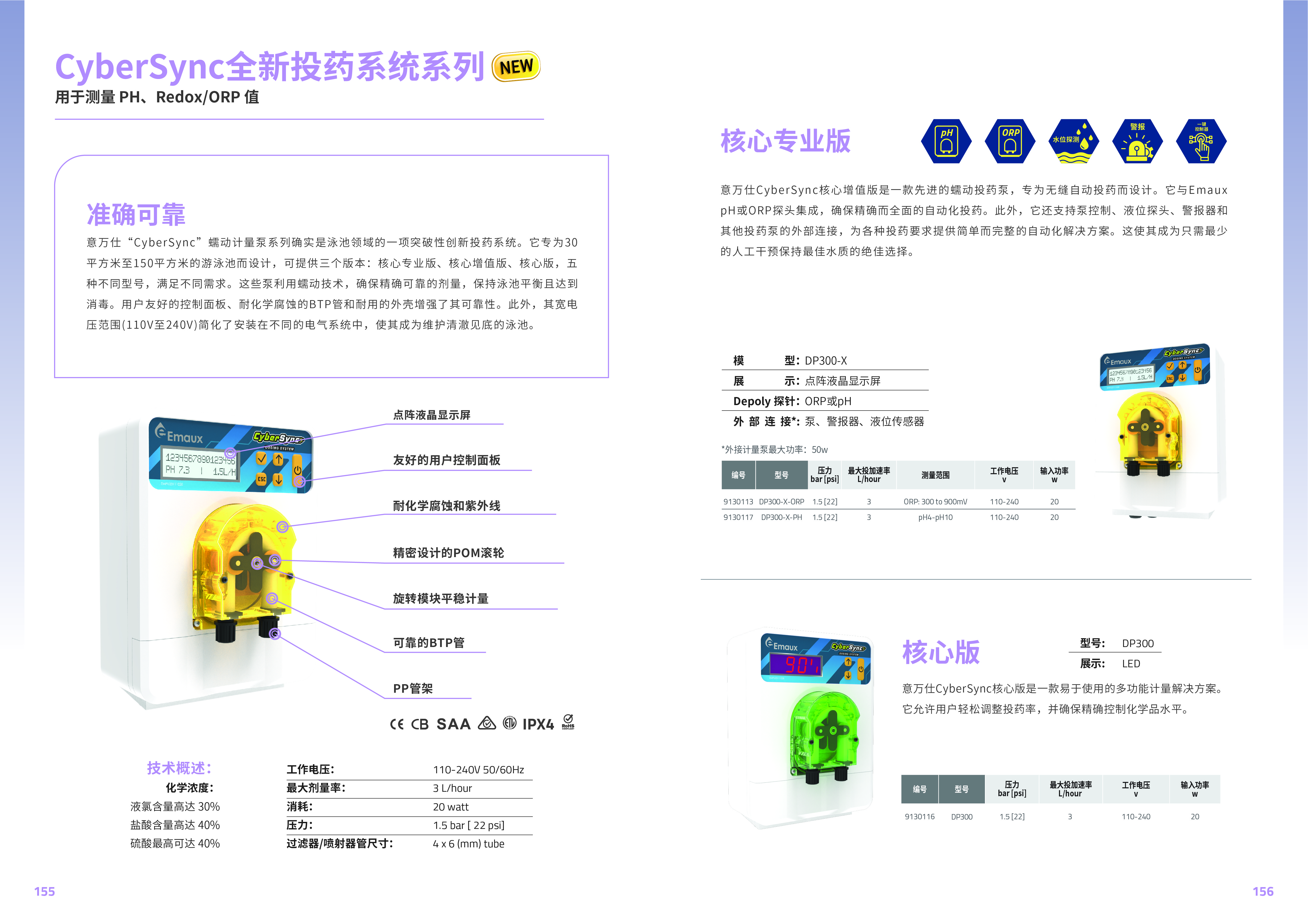 意萬(wàn)仕“CyberSync”蠕動(dòng)計(jì)量泵系列確實(shí)是泳池領(lǐng)域的一項(xiàng)突破性創(chuàng)新投藥系統(tǒng)。它專為30 平方?至150平方?的游泳池?設(shè)計(jì),可提供三個(gè)版本:核心專業(yè)版、核心增值版、核心版,五 種不同型號(hào),滿足不同需求。這些泵利用蠕動(dòng)技術(shù),確保精確可靠的劑量,保持泳池平衡且達(dá)到 消毒。用戶友好的控制?板、耐化學(xué)腐蝕的BTP管和耐用的外殼增強(qiáng)了其可靠性。此外,其寬電 壓范圍(110V至240V)簡(jiǎn)化了安裝在不同的電?系統(tǒng)中,使其成為維護(hù)清澈見(jiàn)底的泳池。