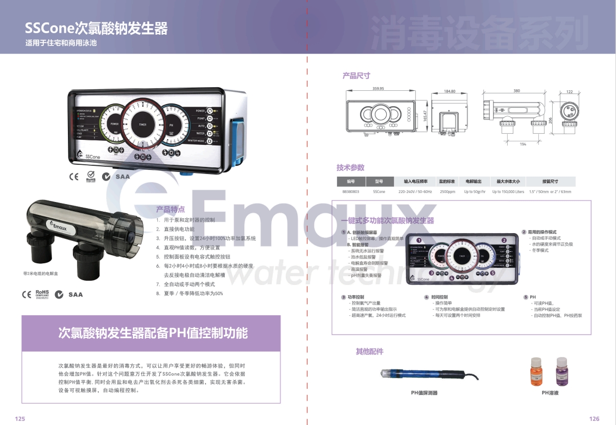 次氯酸鈉發生器是最好的消毒方式,可以讓用戶享受更好的暢游體驗。但同時,它會增加PH值。針對這個問題意萬仕開發了SSCone次氯酸鈉發生器。它會依據控制PH值平衡,同時會用鹽和電去產出氧化劑去殺死各類細菌,實現無害殺菌。設備可視觸摸屏,自動編程控制。