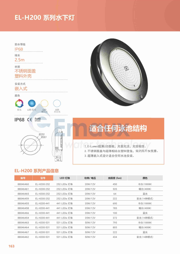1.E-Lumen超薄LED面板,光面光潔,光效極佳。 2.不銹鋼面蓋與超薄相結合塑料壁龕,簡約而不失優雅。 3.超薄嵌入式設計適合任何水池安裝。