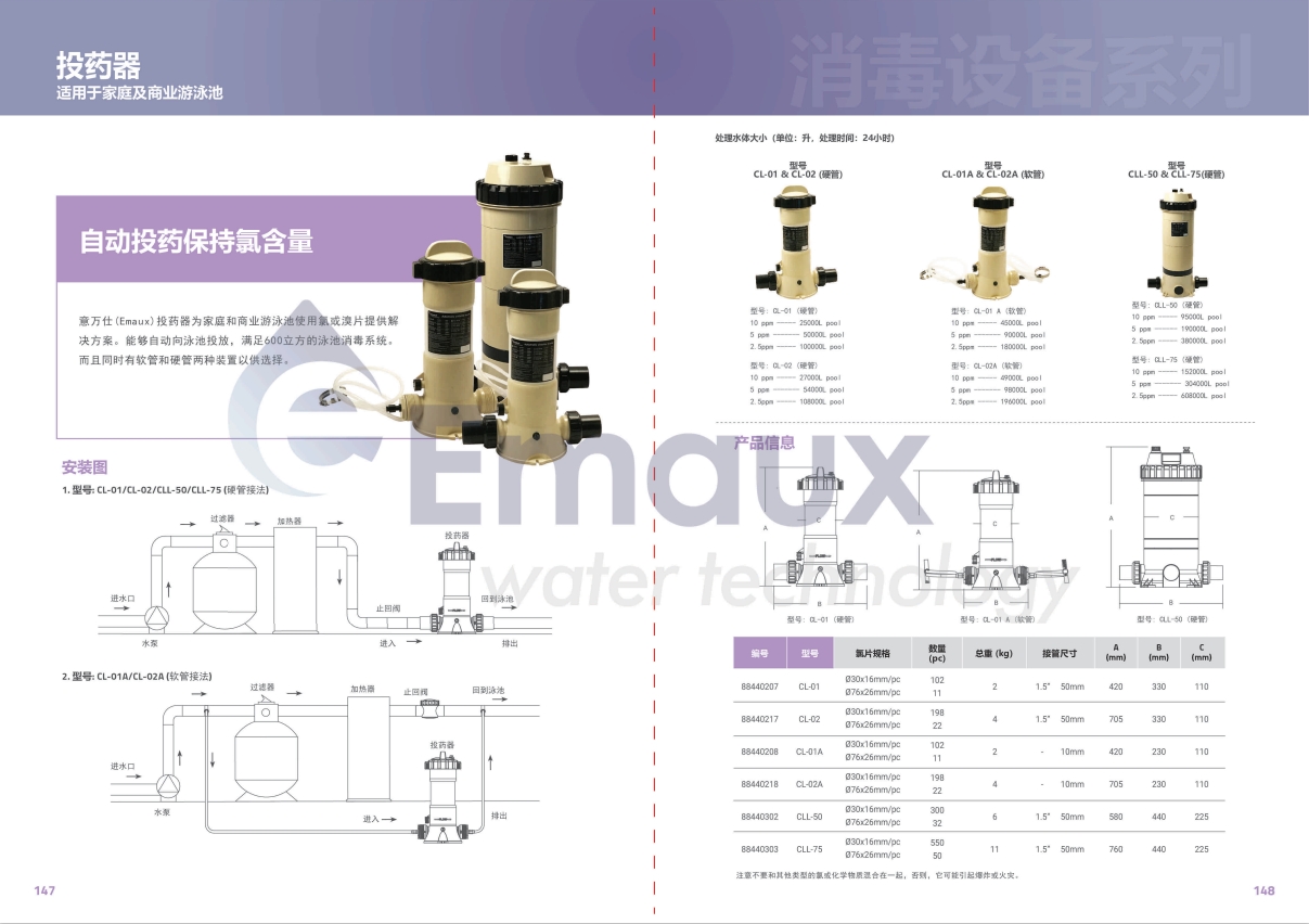 意萬仕(Emaux)投藥器為家庭和商業游泳池使用氯或溴片提供解決方案。能夠自動向泳池投放,滿足600立方的泳池消毒系統。而且同時有軟管和硬管兩種裝置以供選擇。