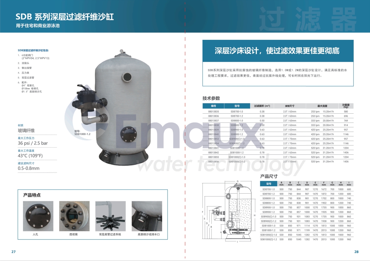 競(jìng)技池SDB系列深層沙缸采用抗腐蝕的玻璃纖維制造,選用1.0M或1.2M的深層沙缸設(shè)計(jì),滿足高標(biāo)準(zhǔn)的水處理工程要求,過(guò)濾效果更佳,表面經(jīng)過(guò)抗紫外線處理,可長(zhǎng)時(shí)間在陽(yáng)光下運(yùn)行。
