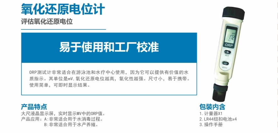ORP測試計非常適合在游泳池和水療中心使用,因為它可以提供有價值的水質指示。其單位是mV,氧化還原電位越高,氧化性越強。尺寸小,易于攜帶。使用簡單,可即時顯示結果。